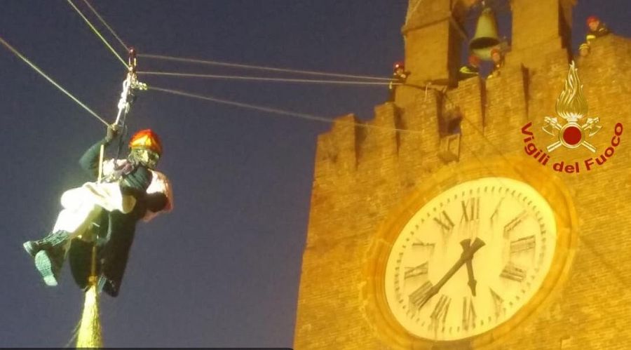 Poi non appena buio, attorno alle 17.30 è stata la volta del lancio dalla torre civica, in piazza dei Caduti, dove, sotto la supervisione dei vigili dl fuoco, la Befana è tornata a solcare il cielo di Cascina, lanciando caramelle dolciumi.