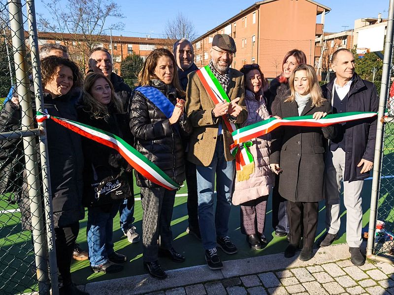 Taglio del nastro per l'area sportiva, con campo polifunzionale e pista di pattinaggio ampliati e riqualificati, nuove piante e più illuminazione
