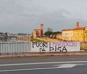 PISA — Nel giorno del derby tra Pisa e Fiorentina, la città si è svegliata con uno striscione affisso nei pressi del ponte Solferino: un gesto che ha riportato al centro del dibattito pubblico il tema dei Marzocchi, i leoni di marmo legati alla dominazione fiorentina e ancora oggi collocati sul lungarno. Il clima della partita, già segnato dalla storica rivalità sportiva fra le due città, ha fatto da sfondo a un messaggio che richiama un passato più profondo, capace di riemergere proprio nei momenti di forte identità collettiva.