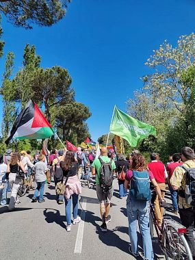 "Oggi parlare di liberazione - hanno spiegato gli attivisti che hanno promosso il corteo del 25 aprile - significa fronteggiare il primo grande rischio globale che è la guerra, purtroppo già una realtà. Questo territorio è un hub strategico e per noi è urgente mettere al centro il ruolo che questo territorio ha negli scenari di guerra, con Camp Darby epicentro e con ricadute su tutta la zona, come il progetto della nuova base militare per i corpi dell'elite dell'Arma dei carabinieri da realizzare nell'ex Cisam all'interno dei confini del parco di San Rossore".