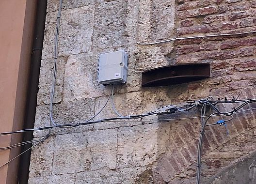 L'ordine degli architetti punta il dito contro scatolette e cavi fissati sulle pietre medievali, protesta anche il consigliere comunale Biondi (Pd)