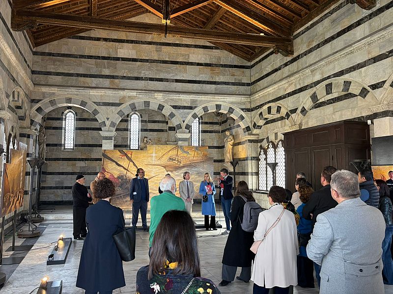 Nel suo intervento, l’assessore ha richiamato anche il rapporto tra le tele esposte e alcuni dei momenti più riconoscibili della storia cittadina. “Alla Spina, proprio a pochi metri da dove venivano costruite le navi, si trovano invece tre quadri che raccontano la storia della Repubblica Marinara” ha aggiunto Bedini, soffermandosi sul legame tra le opere, la città e le sue rievocazioni storiche.
