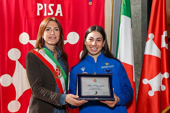 A premiare i due protagonisti è stata Frida Scarpa, assessora allo Sport, che a Cambi ha consegnato un bacino ceramico decorato con l’effige della croce pisana, simbolo del legame indissolubile tra la storia della sua famiglia e l’identità cittadina. A Pazzaglia, invece, è stata invece conferita una targa celebrativa con l’incisione: "Una pisana in vetta. Con orgoglio e riconoscenza".